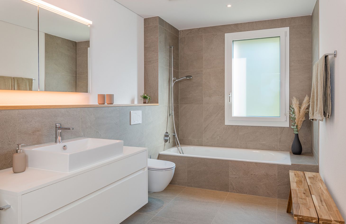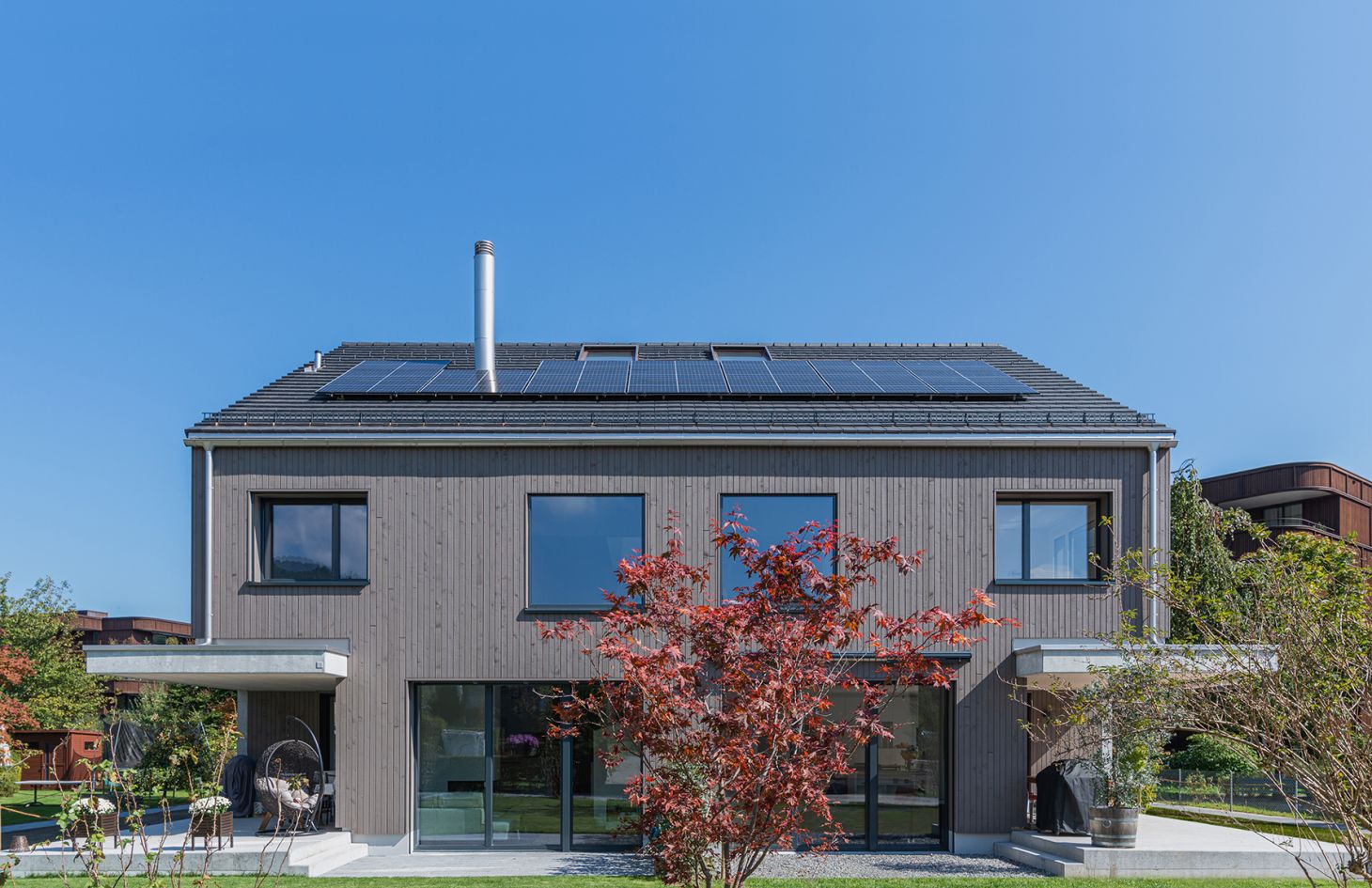 Das realisierte Bauvorhaben umfasst den Neubau eines zweigeschossigen Doppeleinfamilienhauses mit Dachgeschoss und einer Hauptausrichtung nach Westen. Es wurde eine optimale Einfügung in das bestehende Areal angestrebt. Die Setzung, Volumetrie und Dachform lehnen sich bewusst an die umliegenden, bestehenden Gebäude an. Ortsübliche Elemente wie der kompakte Punktbau, das Hochparterre, die Holzfassade sowie die farbliche Zurückhaltung der Gebäudefassung werden aufgegriffen. Das Gebäude ist ein Hybridbau mit hinterlüfteter Holzfassade. Der Neubau passt sich der vorhandenen Aussenraumgestaltung an. Durch die zusammenhängende, natürliche Gartenlandschaft ohne weiteren Asphaltflächen wird der Eingriff ins Landschaftsbild möglichst klein gehalten.