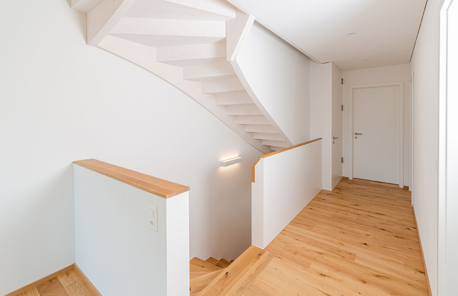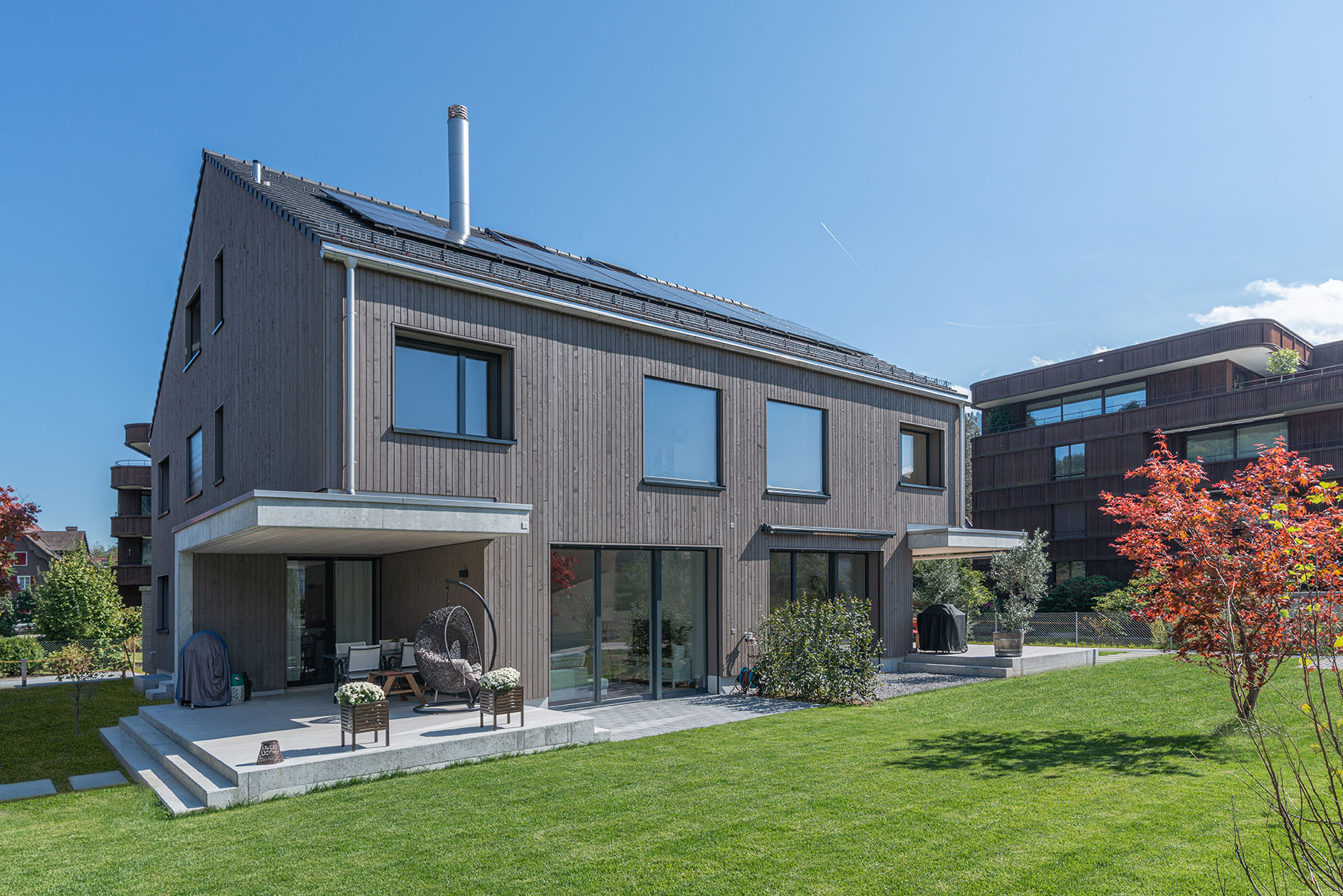 Das realisierte Bauvorhaben umfasst den Neubau eines zweigeschossigen Doppeleinfamilienhauses mit Dachgeschoss und einer Hauptausrichtung nach Westen. Es wurde eine optimale Einfügung in das bestehende Areal angestrebt. Die Setzung, Volumetrie und Dachform lehnen sich bewusst an die umliegenden, bestehenden Gebäude an. Ortsübliche Elemente wie der kompakte Punktbau, das Hochparterre, die Holzfassade sowie die farbliche Zurückhaltung der Gebäudefassung werden aufgegriffen. Das Gebäude ist ein Hybridbau mit hinterlüfteter Holzfassade. Der Neubau passt sich der vorhandenen Aussenraumgestaltung an. Durch die zusammenhängende, natürliche Gartenlandschaft ohne weiteren Asphaltflächen wird der Eingriff ins Landschaftsbild möglichst klein gehalten.